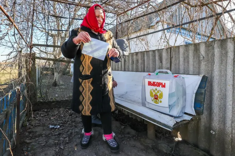 Подпись к фото, Голосование в аннексированной Россией Херсонской области в условиях войны