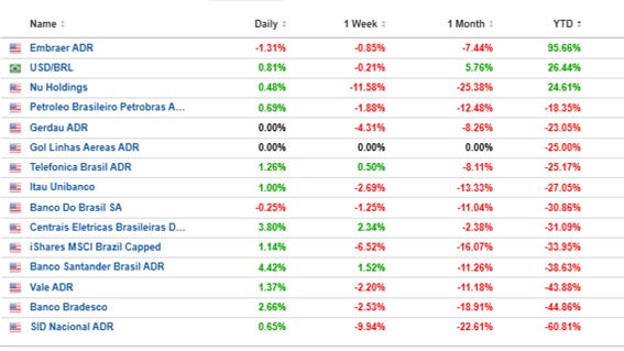 Особенно пострадали акции таких компаний, как Siderurgica Nacional (падение на 63%), Banco Bradesco (на 45%), Vale (на 43%), и Banco Santander (на 41%). В то же время, Petrobras, Gol, Gerdau, Itaú, Telefónica, Banco do Brasil и Centrais Electricas показали менее значительные падения, варьирующиеся от 21% до 31%. Однако есть и положительные исключения: Embraer вырос на 96%, а Nu Bank — на 28%.