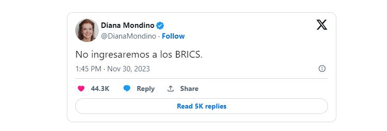 Аргентина решила не присоединяться к альянсу экономик БРИКС, позиционирующему себя как противовес G7 и евроатлантическому миру. «Мы не будем вступать в группу БРИКС», — написала в соцсети X в четверг, 30 ноября, будущий министр иностранных дел Аргентины Диана Мондино