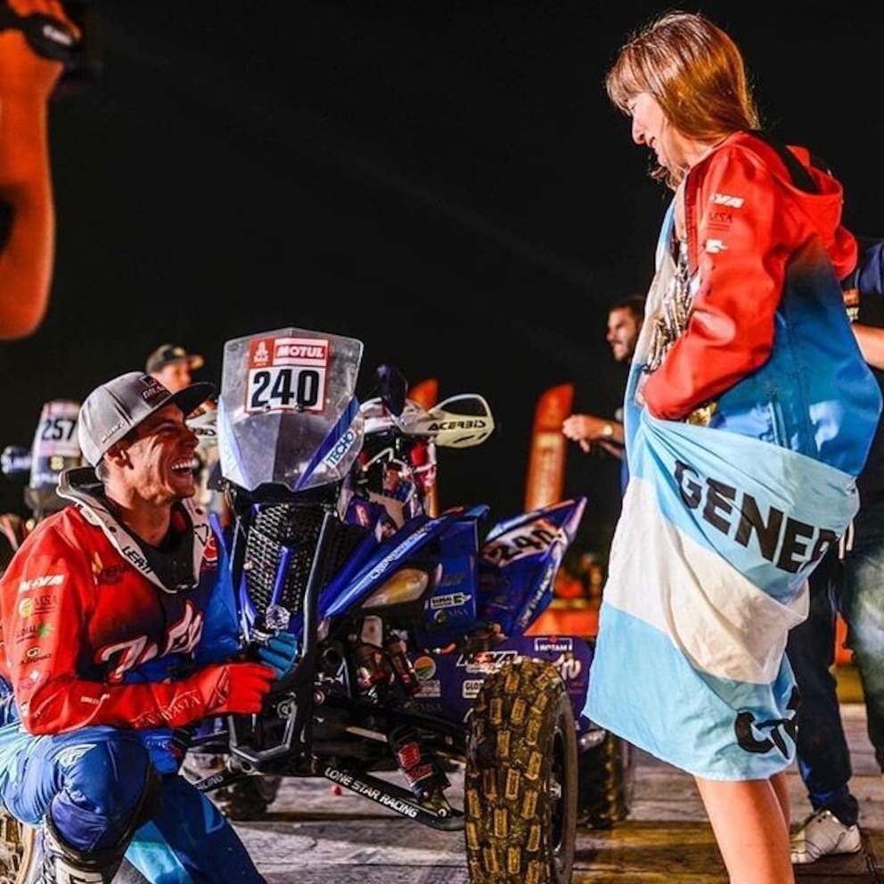 Он выиграл ралли «Дакар 2019» на квадроциклах, которое проходило в Перу, и на финише попросил ее выйти за него замуж. Затем они составили дуэт, чтобы соревноваться в категории Challenger (песчаные транспортные средства), и вот уже в третий раз они вместе участвуют в гонках в Саудовской Аравии.