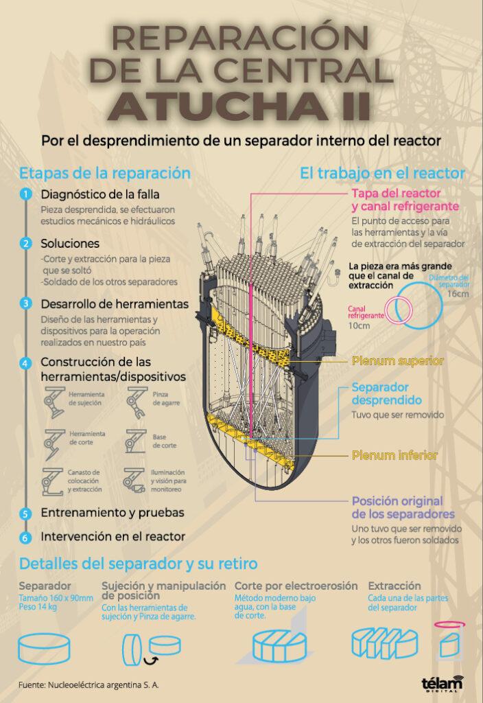 Он подчеркнул, что «решение, реализованное компанией Nucleoeléctrica, заключалось в проведении ремонта дистанционно, через отверстия для загрузки и выгрузки топлива в реакторе, без необходимости его демонтажа», как это было рекомендовано в первоначальном проекте станции, что позволило сократить время ремонта с четырех лет до десяти месяцев.