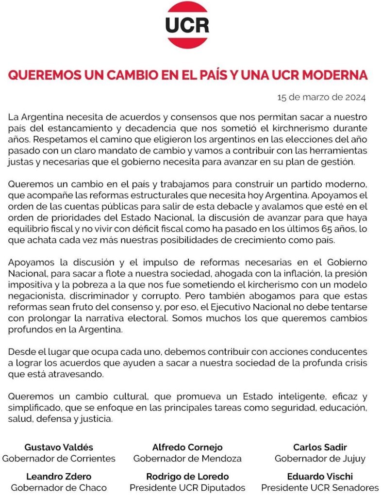 Главная идея обращения «Мы хотим перемен в стране и современного UCR». Лидеры отметили, что стране нужны «соглашения и консенсус», чтобы вывести Аргентину из «стагнации и упадка», в которых они обвинили кишнеризм.