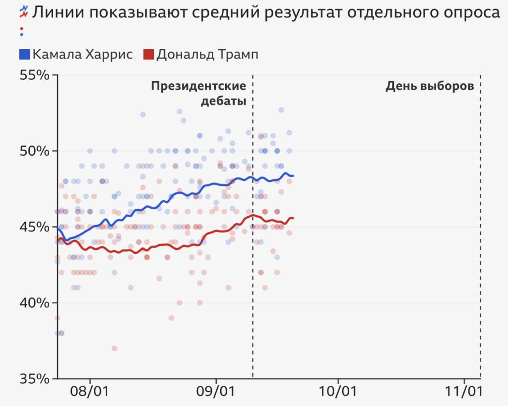 В среднем кандидат от Демократической партии Камала Харрис опережает Трампа в общенациональных опросах, как показано на диаграмме ниже (последние данные округлены до ближайшего целого числа).