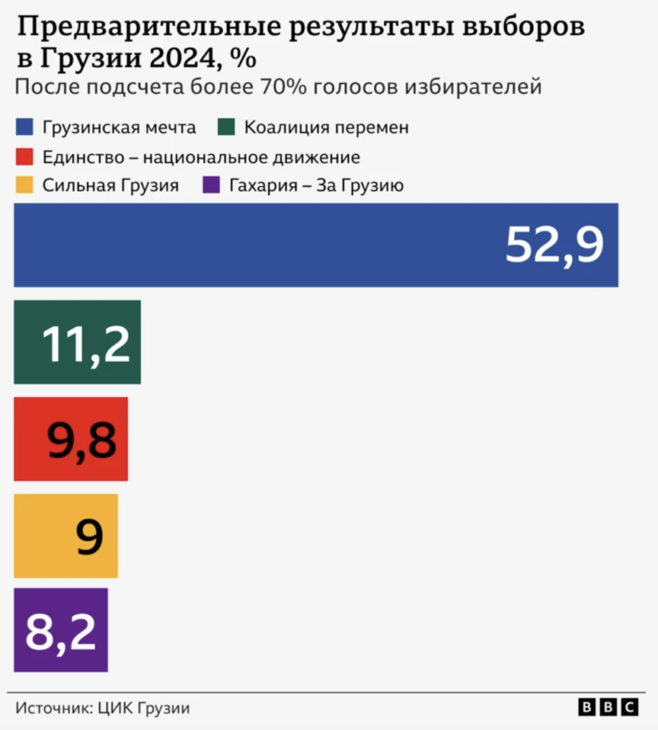 Лидеры оппозиционных партий даже успели сделать несколько победных заявлений. «Несмотря на насилие, победила Европа и победил грузинский народ. Сегодня победила не какая-то одна партия, победило европейское будущее […]. Время Иванишвили закончилось», — заявила Тина Бокучава, председатель партии «Единство — национальное движение».