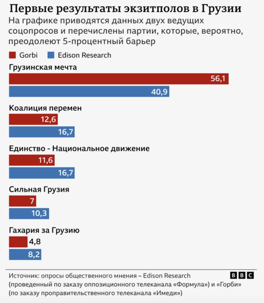 А вот два оппозиционных канала — Mtavari и Formula — получили другие результаты: их опросы давали «Мечте» 40-42%. На основании этих двух экзитполов оппозиция была уверена, что совместно они выиграли выборы.