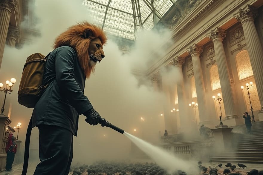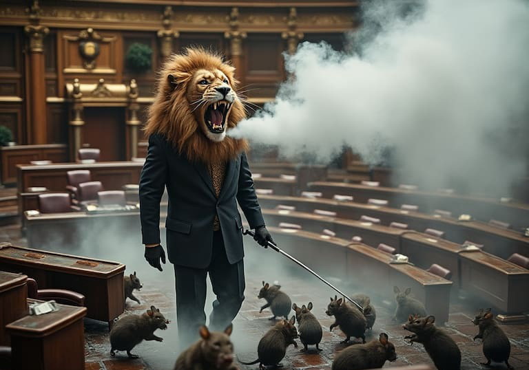Изображения, созданные с помощью ИИ, которые Милей опубликовал на своем аккаунте в социальных сетях, представляют льва в костюме — символ, с которым он себя ассоциирует. На одном из рисунков лев выдувает дым, на другом — извергает жидкость, напоминающую яд, отгоняя крыс, что символизирует очищение политического пространства. Милей ясно дает понять, что его цель — дезинфекция Конгресса, где он видит «гнездо крыс».