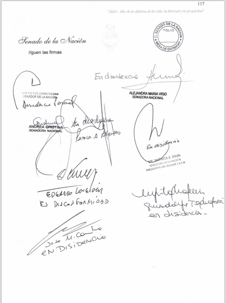 Это произошло во время встречи в Salón Gris, на которой присутствовали, в частности, Хосе Мария Карамбия (Санта-Крус), который до последней минуты угрожал представить свое собственное мнение, а также сенатор Мартин Лусто (CABA), который не изменил своего решения.