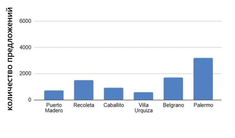 Исследование подтвердило, что шесть районов с наибольшим предложением — это Палермо, Бельграно, Реколета, Кабаллито, Пуэрто Мадеро и Вилла Уркиза. На вышеупомянутые районы приходится 58,51% от общего объема предложения (среднее предложение, опубликованное на различных порталах).