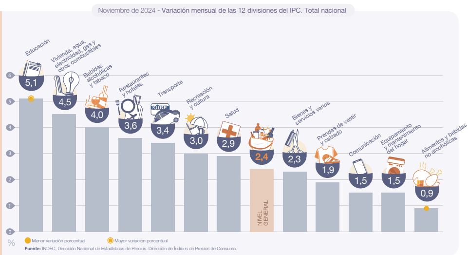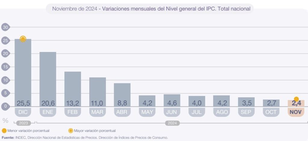 Министр экономики, Луис Капуто, подчеркнул в сообщении X, что розничная инфляция в 2,4% в ноябре была «самой низкой с июля 2020 года», и указал: «Продукты питания 0,9%. Товары 1,6%. Базовая продовольственная корзина 1,1%. Общая базовая корзина 1,5%. Процесс дезинфляции продолжается. Все ближе и ближе к снижению ползучей привязки до 1%».