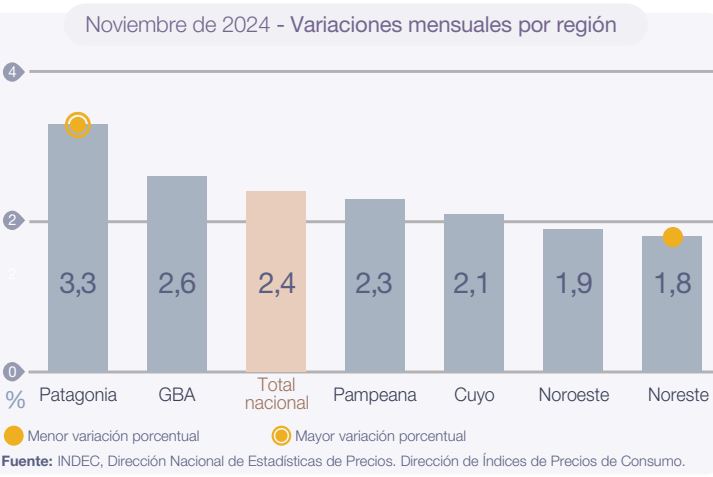 Патагония стала регионом с самым высоким месячным приростом (+3,3%), за ней следуют Большой Буэнос-Айрес (+2,6%), Pampeana (+2,3%), Cuyo (+2,1%), Noroestre (+1,9%) и Noreste (+1,8%).
