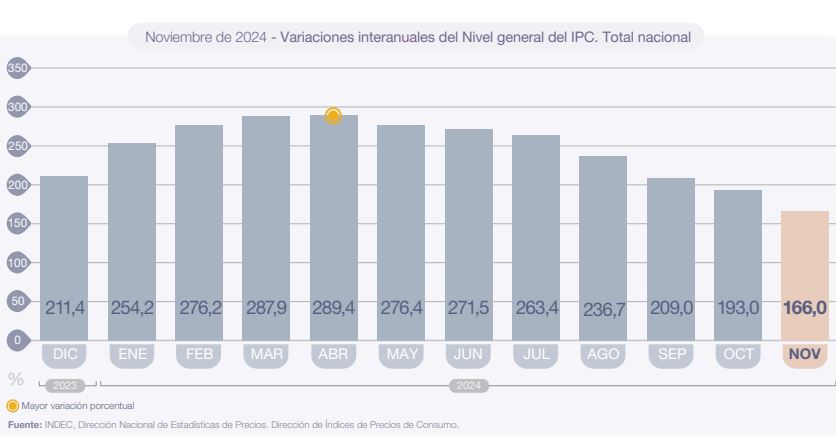 Национальный институт статистики и переписи населения (INDEC) сообщил, что инфляция в ноябре составила 2,4%, закрепив тенденцию замедления роста потребительских цен. По данным официального органа, за последние 12 месяцев накопленный рост достиг 166%. Это самый низкий месячный показатель с июля 2020 года. Эта цифра соответствует ожиданиям правительства и рынка, которые прогнозировали показатель менее 3%. В октябре индекс потребительских цен зафиксировал самый низкий рост почти за три года — 2,7%, а накопленный годовой прирост составил 193%.
