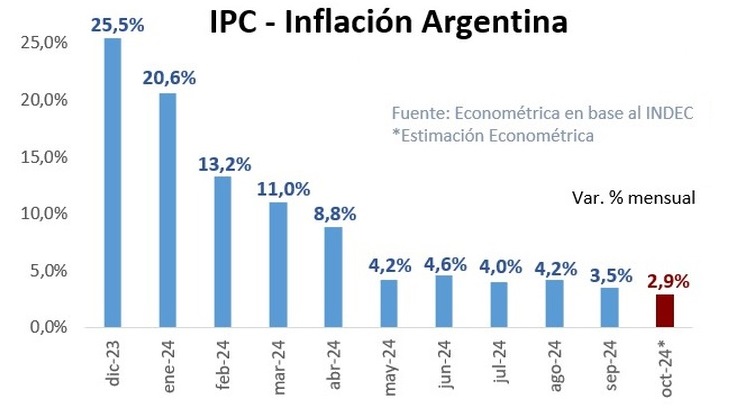 Также был опубликован индекс потребительских цен (CPI-CREEBBA) за октябрь, который показал изменение на 2,4%, отражая второй месяц подряд замедление по сравнению с предыдущим измерением (-0,7 процентных пункта). «С этим рекордом (самым низким с октября 2021 года) совокупная инфляция в течение 2024 года достигла 121%, а изменение за год составило 211%, — подчеркнули они.