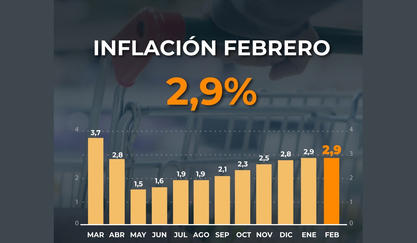 Данные февраля совпали с прогнозами частных консалтинговых компаний (2,8–3,0%): Analytica — 2,8%, Eco Go и C&T — 2,9%. В городе Буэнос-Айресе инфляция оказалась чуть ниже — 2,6%, с замедлением на 0,5 п.п. по сравнению с январем.