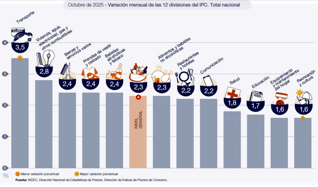 Транспорт лидировал по месячному росту с 3,5 процента, за ним Жильё, вода, электричество, газ и другие топлива (2,8 процента). Продовольствие и безалкогольные напитки повлияли на 2,3 процента, кроме Патагонии, где доминировал раздел жилья.
