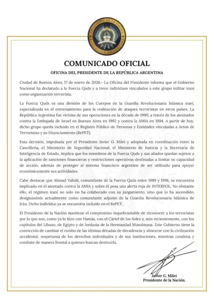 В заключение Офис Президента подтвердил «непоколебимую приверженность» Милея (Milei) «называть террористов тем, кем они являются», перечислив предыдущие аналогичные решения в отношении ХАМАС (Hamás), Картеля Солнц и различных ветвей Братьев-мусульман на Ближнем Востоке.