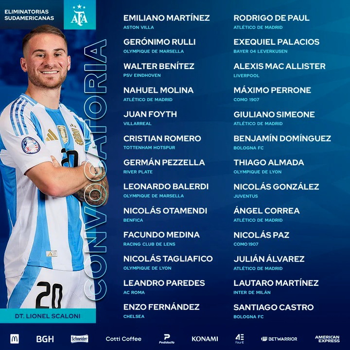 Помимо Лионеля Месси, из-за травм матчи пропустят защитники Гонсало Монтьель и Лисандро Мартинес, а также полузащитники Пауло Дибала и Джовани Ло Сельсо. В связи с этим тренер Скалони включил в состав новичков: полузащитника Максимо Перроне из итальянского «Комо 1907» и форвардов Бенджамина Домингеса и Сантьяго Кастро из «Болоньи» (Серия А).
