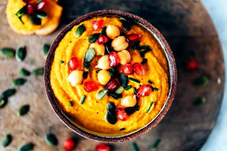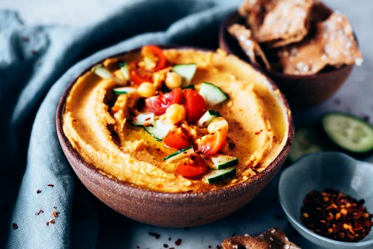 Хумус — это крем или пюре, приготовленное из вареного нута, тахини (жареный молотый кунжут), оливкового масла, лимонного сока и чеснока.