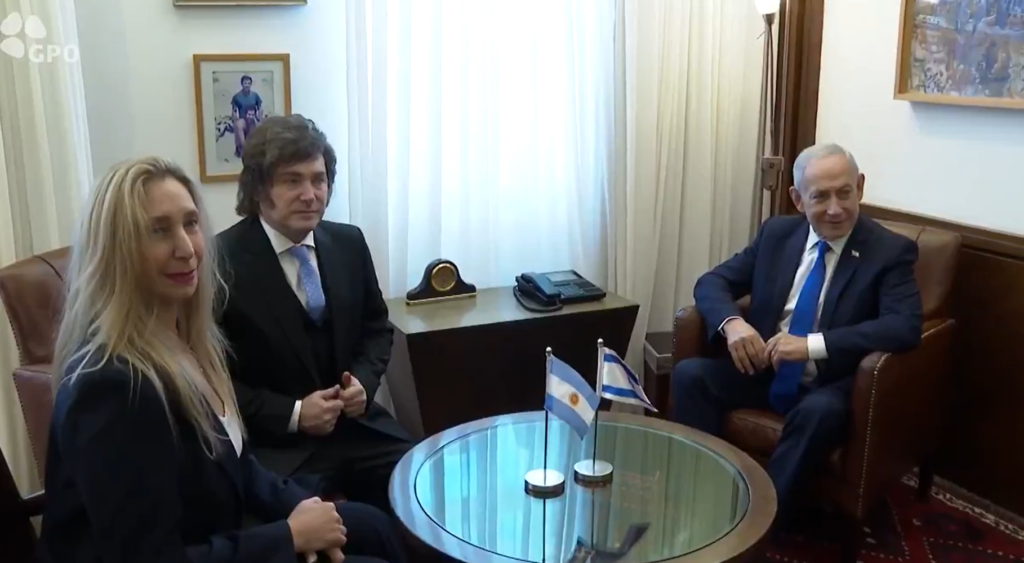 Вскоре после этого состоялась встреча с премьер-министром Израиля Биньямином Нетаньяху в его рабочем кабинете в Иерусалиме. Переговоры прошли в подчёркнуто тёплой атмосфере. Израильский лидер назвал Милея «великим другом Государства Израиль» и «выдающимся мировым лидером», акцентировав его политическую решимость и моральную позицию. В приветственном обращении Нетаньяху заявил: «Добро пожаловать в Израиль, добро пожаловать в Иерусалим, мой друг, президент Аргентины Хавьер Милей. Великий друг Государства Израиль. Израиль и Аргентина вместе, сильнее, чем когда-либо».