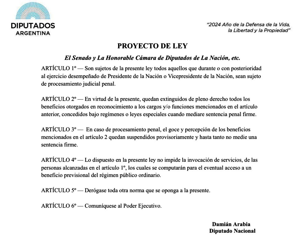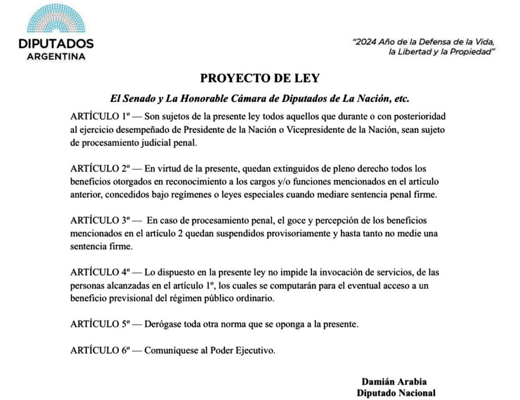 В понедельник Президент Хавьер Милей выразил свою поддержку законопроекту депутата от PRO Дамиана Арабиа о лишении пожизненной пенсии бывших президентов и бывших вице-президентов, которые были осуждены в уголовном порядке.