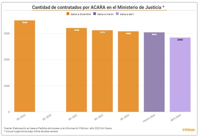 Сегодня в Министерстве юстиции работают 2 843 сотрудника, получающих зарплату от ACARA, и эта цифра превышает 1 986 человек, составляющих постоянный и временный персонал Министерства и других подведомственных ему учреждений, таких как Управление по борьбе с коррупцией (OA), INADI, Отдел финансовой информации (UIF) и Казначейская прокуратура (Procuración del Tesoro).