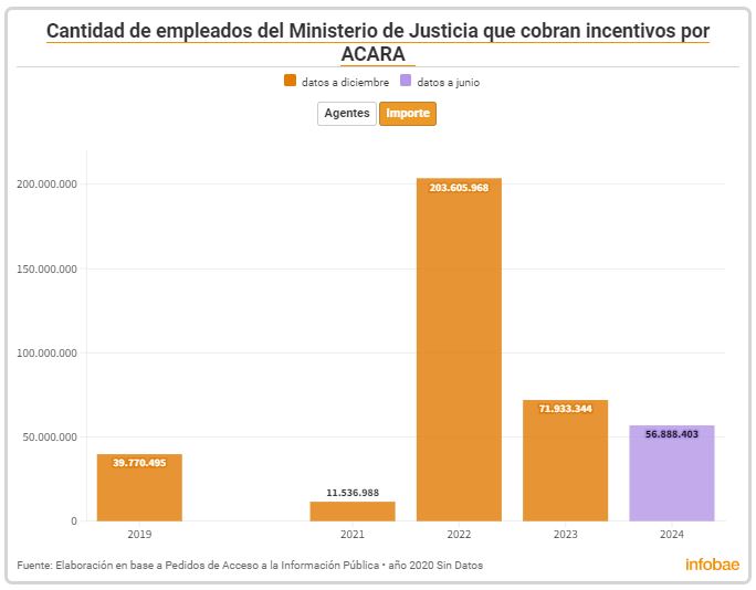 Согласно ответу Министерства юстиции на запрос Infobae о доступе к информации, в настоящее время 68 сотрудников Министерства получают «стимулы», выплачиваемые ACARA, на общую сумму почти 57 миллионов в июне.