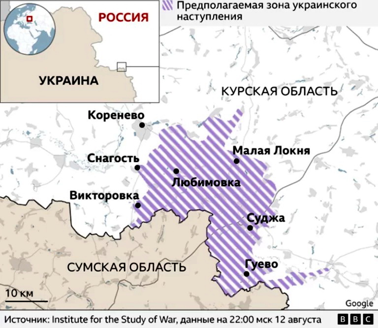 В понедельник появились видеоподтверждения форсирования украинскими подразделениями реки Псёл и занятия ими села Гуево к востоку от Суджи. В районе других сёл восточнее Гуево — Спального и Плехово — шли бои, были сообщения, что они тоже перешли под контроль ВСУ, но эта информация пока не подтверждена.
