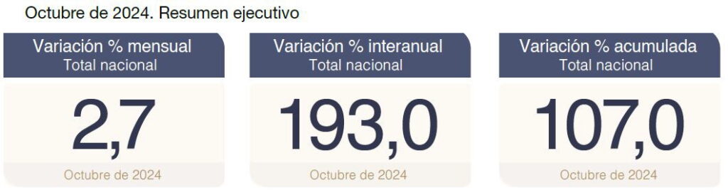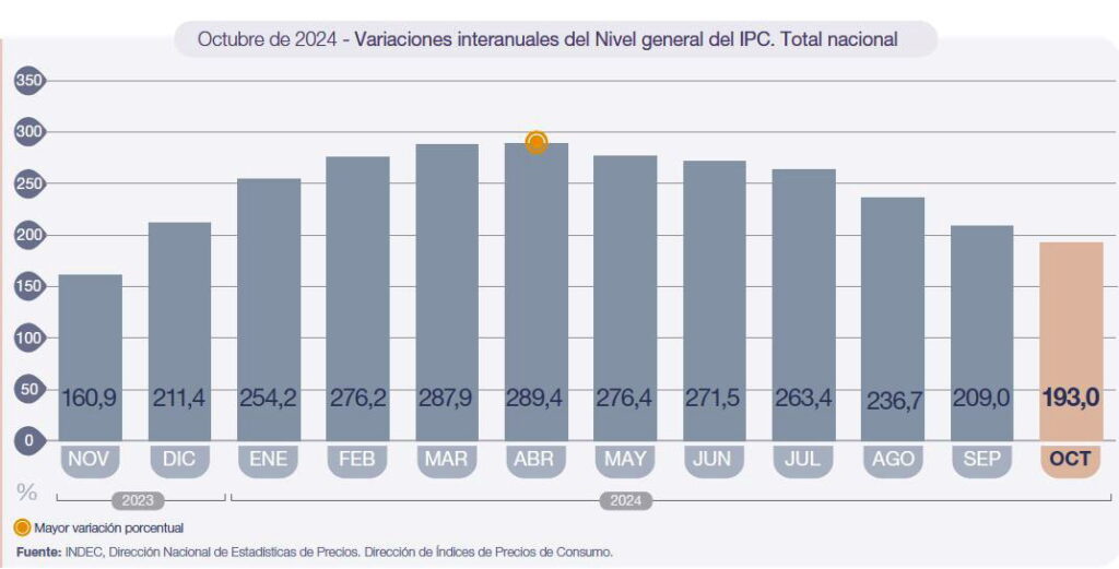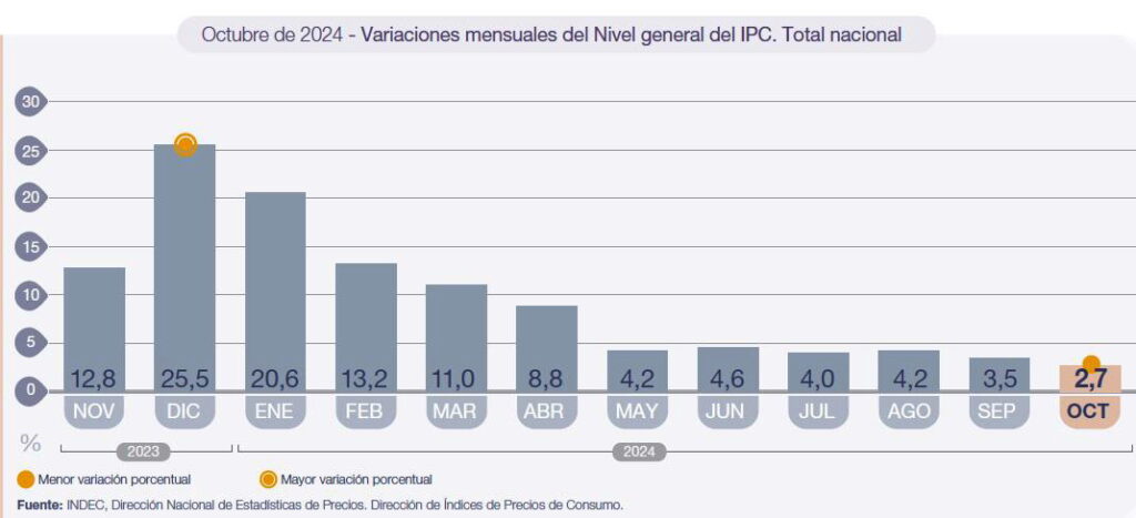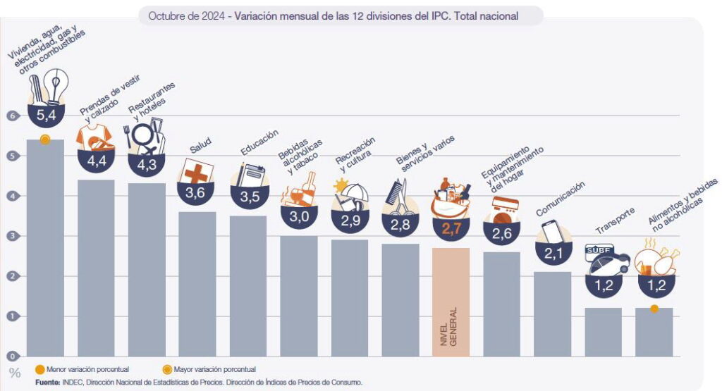 Аналогичным образом, INDEC сообщил, что двумя категориями, в которых были зарегистрированы наименьшие изменения в октябре 2024 года, были транспорт (1,2%) и продукты питания и безалкогольные напитки (1,2%). На уровне категорий основной ИПЦ (2,9%) возглавил рост, за ним следует регулируемый (2,7%), а сезонный ИПЦ увеличился на 1,4%.
