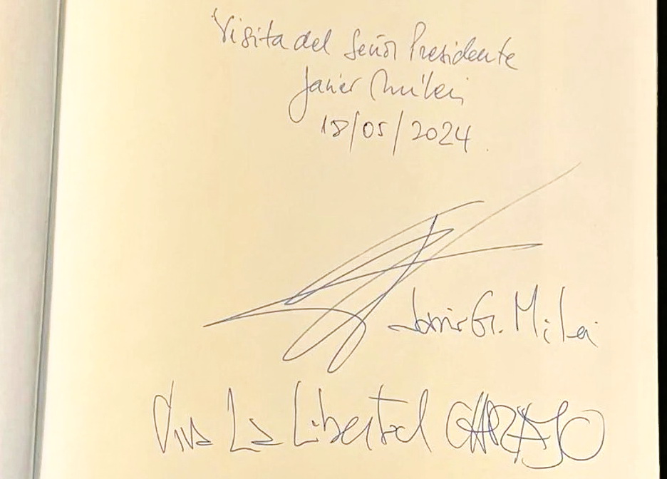 Одна из целей визита президента милея в Испанию, это совместно участие мероприятия с лидером правой партии Vox, Сантьяго Абаскалем. После которого президент оставил запись в книге почетных гостей.