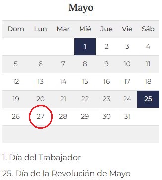 Следующий общий банковский выходной — 25 мая, когда отмечается День Майской революции. Он воздает должное событиям 1810 года, которые привели к формированию первого национального правительства.