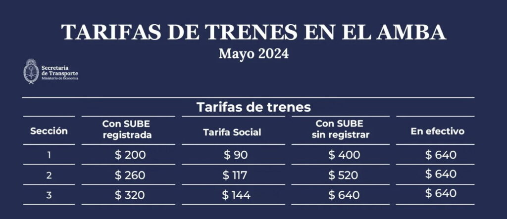 Для служб AMBA, включая линии Sarmiento, Roca, Mitre, San Martín, Belgrano Sur, Belgrano Norte, Urquiza и Tren de la Costa, новые тарифы для