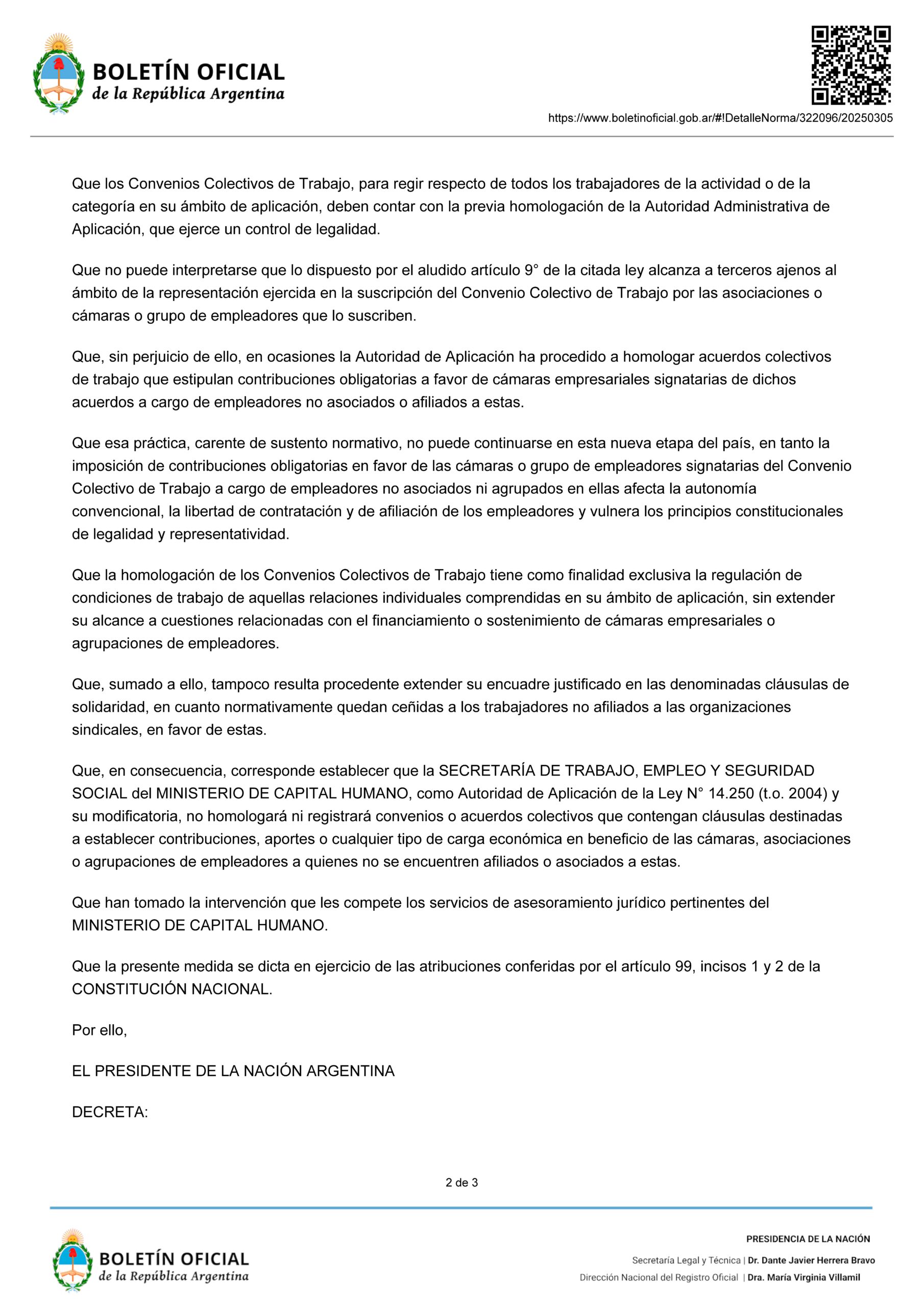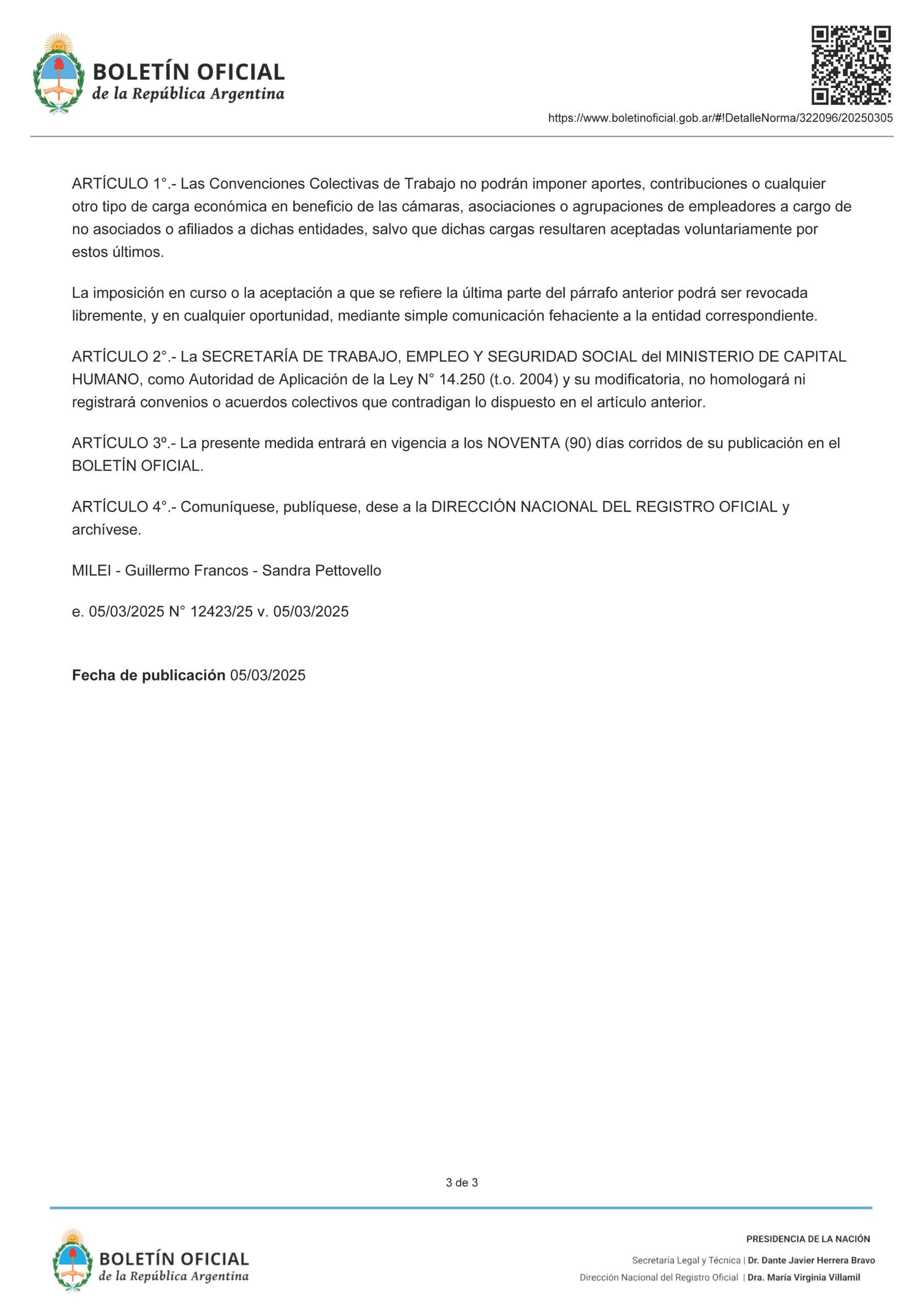 Он подчеркнул, что закон 14.250 должен регулировать только условия труда, а не служить инструментом для сбора средств в пользу частных организаций. Министр Луис Капуто также поддержал меру, отметив, что она снизит издержки, которые в итоге оплачивали потребители — «каждый раз, когда мы делаем покупки».