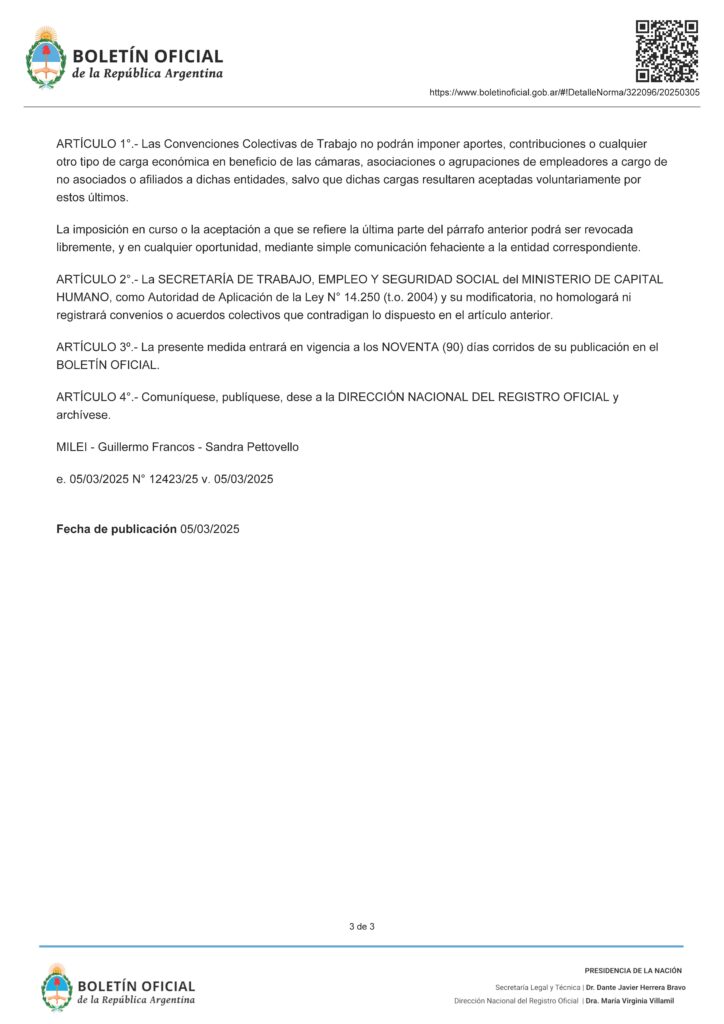 Правительство Аргентины приняло важное решение, которое меняет правила игры для бизнеса: с помощью декрета 149/2025, опубликованного в среду в «Официальном Бюллетене», оно отменило обязательные взносы в деловые палаты, ранее включенные в некоторые коллективные трудовые договоры.