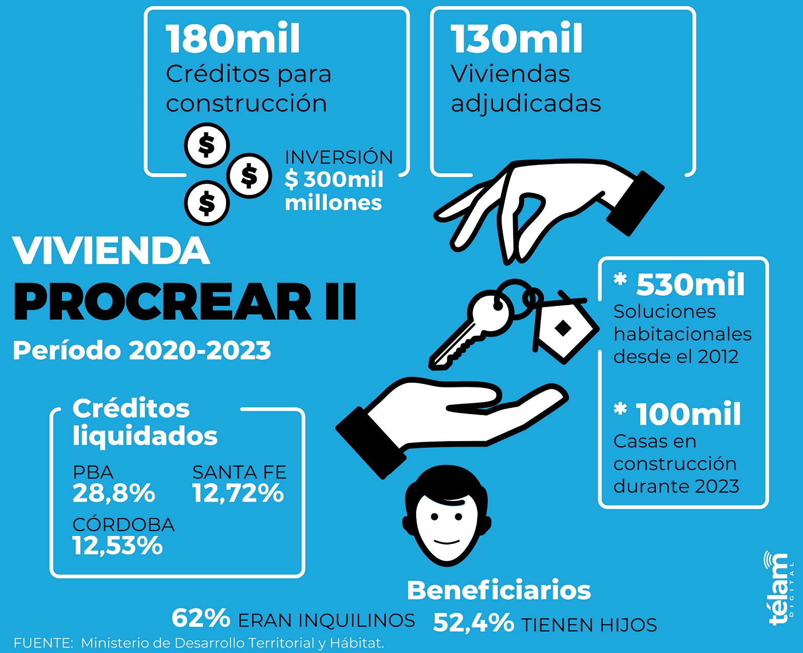 Министерство территориального развития и жилья предоставило более 180 тыс. кредитов на строительство и выделило около 130 тыс. домов в рамках программы Procrear II в период 2020-2023 гг. с момента запуска программы в 2012 г., что в общей сложности составляет 530 тыс. единиц жилья.