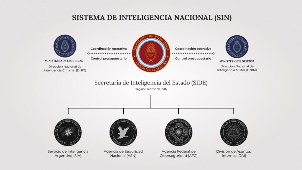 Реструктуризация SIDE включает в себя создание четырех специальных областей: Аргентинской разведывательной службы, Агентства национальной безопасности, Федерального агентства по кибербезопасности и Отдела внутренних дел.