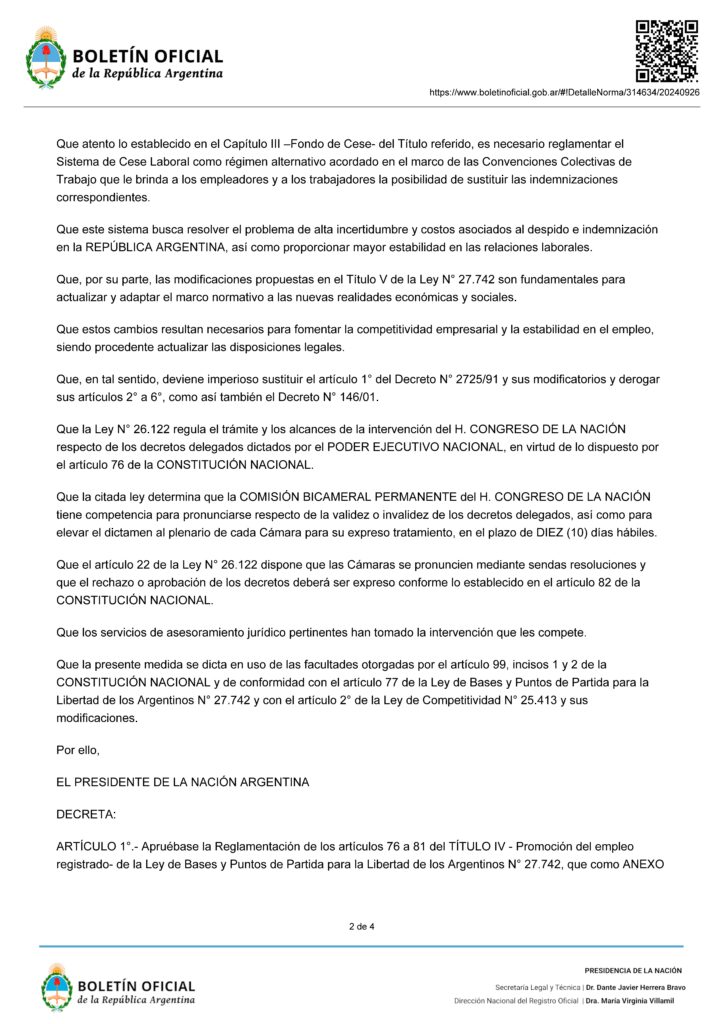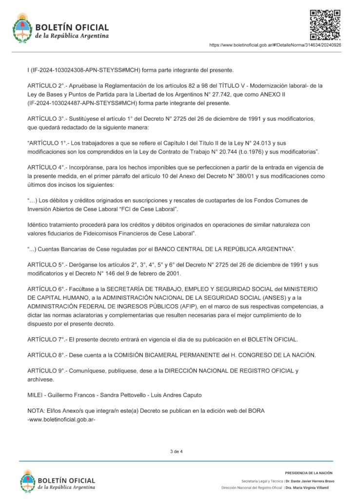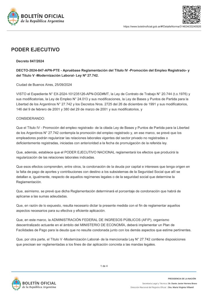 В указе 847/2024, опубликованном в этот четверг, говорится следующее: «Утвердить Положение о статьях с 76 по 81 раздела IV — Содействие зарегистрированной занятости — Закона об основах и отправных точках свободы аргентинцев № 27 742, который является ПРИЛОЖЕНИЕМ I», в дополнение к утверждению „статей с 82 по 98 раздела V — Модернизация труда“.