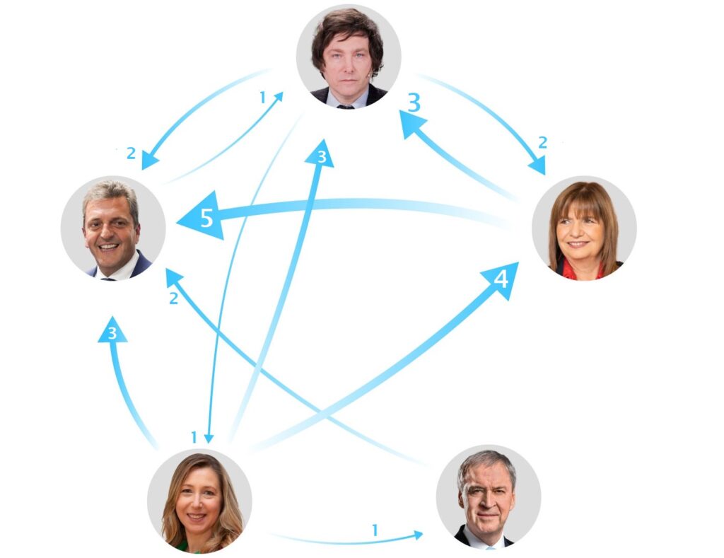 Хавьер Милей из La Libertad Avanza, Патрисия Буллрич из Juntos por el Cambio, Серхио Масса из Unión por la Patria, Хуан Скьяретти из Hacemos por Nuestro País и Мириам Брегман из Frente de Izquierda Unidad встретились лицом к лицу в первых президентских дебатах в Аргентине.