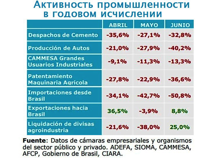В мае работа отразила резкое снижение в автомобильном секторе (40,2%), поставках цемента (32,8%) и оформлении сельскохозяйственной техникиу (36,6%). С другой стороны, спрос на электроэнергию со стороны крупных промышленных потребителей также продолжал падать (13,3% в годовом исчислении), а что касается торговли с Бразилией, то импорт упал (50,8%), в то время как экспорт вырос (8,8%), говорится в отчете. Наконец, оборот иностранной валюты вырос (на 25%) после двух месяцев снижения, чему способствовало восстановление сельскохозяйственного сектора.