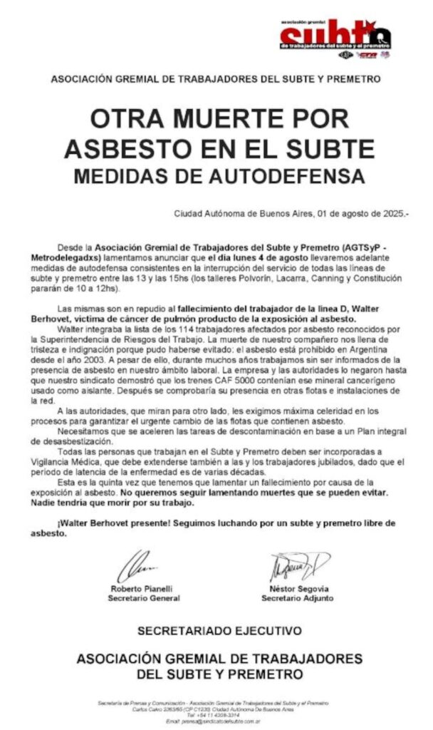 AGTSyP заявил, что Уолтер Берховет, водитель линии D, умер от рака лёгких, вызванного асбестом — канцерогенным материалом, запрещённым в Аргентине более 20 лет назад, но всё ещё присутствующим в поездах метрополитена.