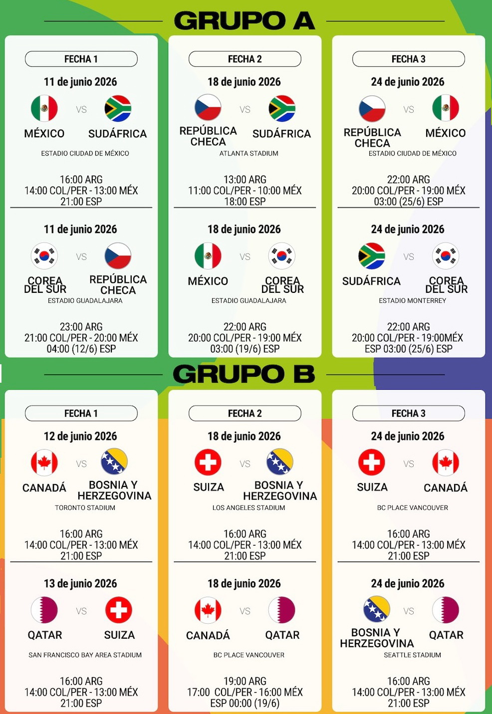 - Матч открытия: 11 июня — Мексика — ЮАР (Estadio Ciudad de México, 16:00 по аргентинскому времени)