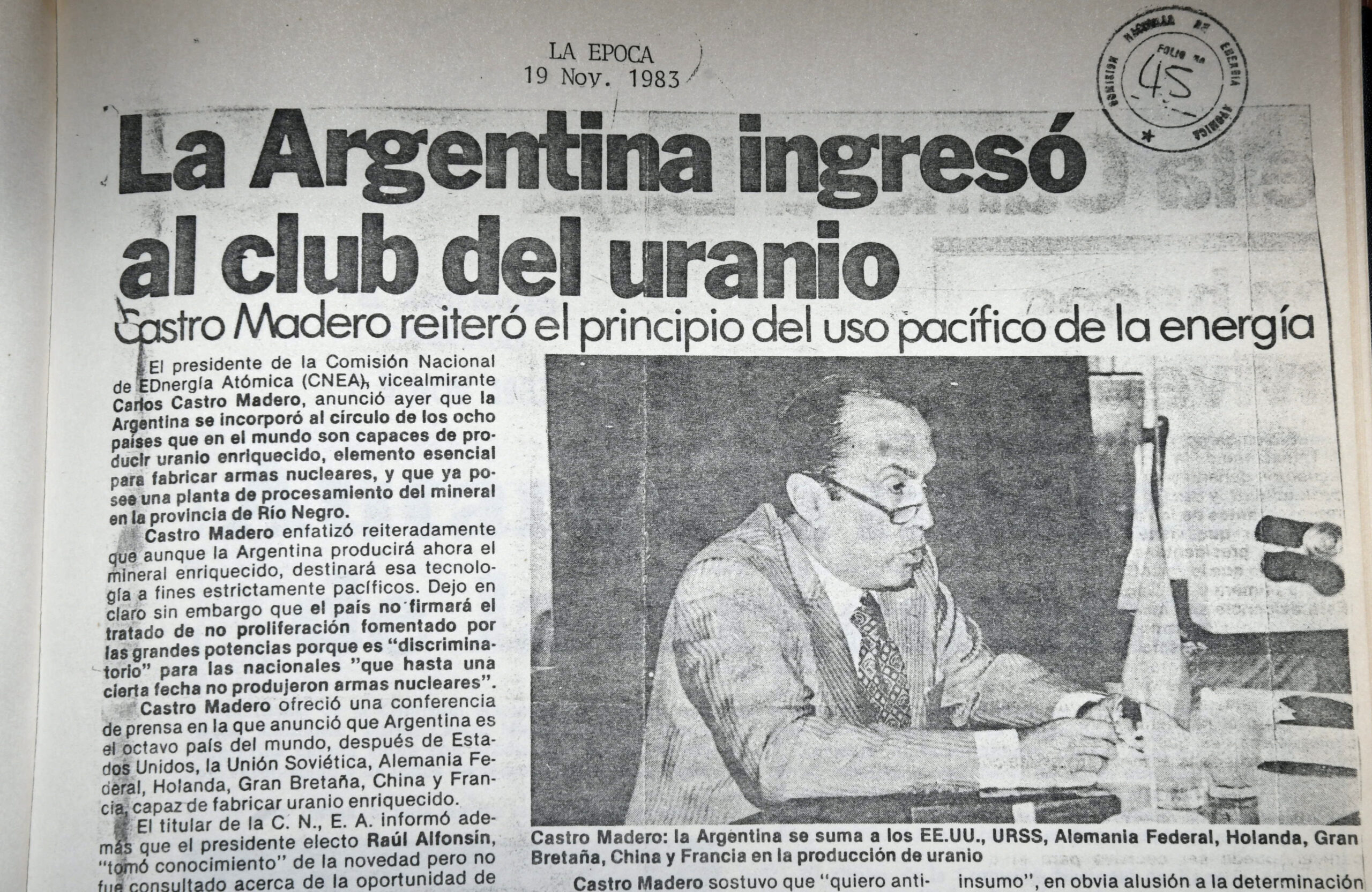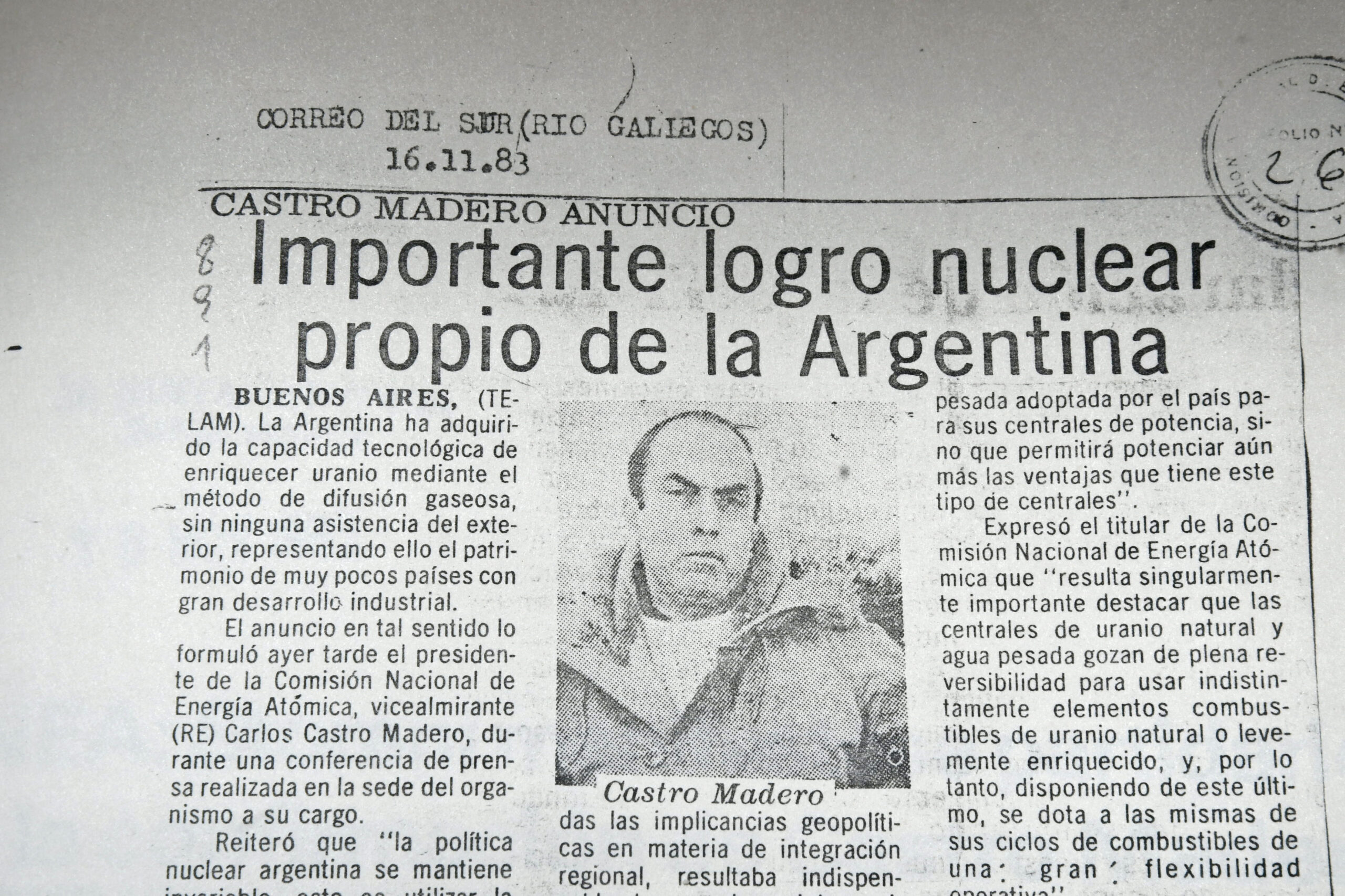18 ноября 1983 г., Аргентина объявила всему миру о том, что ей удалось обогатить уран — и тем самым завершить ядерный топливный цикл — внутри страны в рамках секретного проекта колоссального масштаба, реализованного в Пилканиеу, в 60 км от Барилоче, что приблизило страну к суверенитету в области энергетики и открыло двери в избранный «клуб стран», овладевших этой важной технологией.