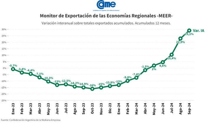 Согласно данным Монитора экспорта региональных экономик (MEER), подготовленного Аргентинской конфедерацией средних предприятий (CAME), сентябрь завершился ростом экспорта региональных экономик на 29,1% в долларах и 26,5% в тоннах, что означает увеличение за год на 1 948,8 миллионов долларов США в общем объеме экспорта и на 1,5 миллиона тонн в объеме торговли. Средняя экспортная цена для региональных экономик Аргентины составила 1 230 долларов США.