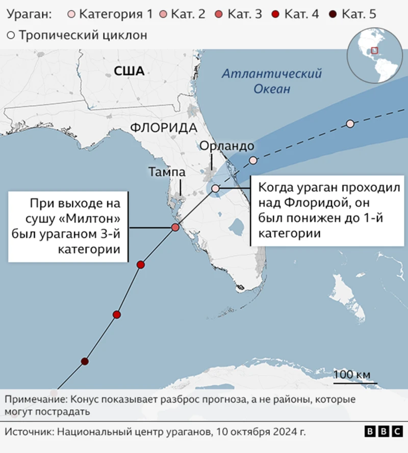 По прогнозам синоптиков, «Милтон» сохранит ураганную силу, пересекая Флориду в четверг утром, но после выхода в Атлантику, скорее всего, постепенно ослабнет.