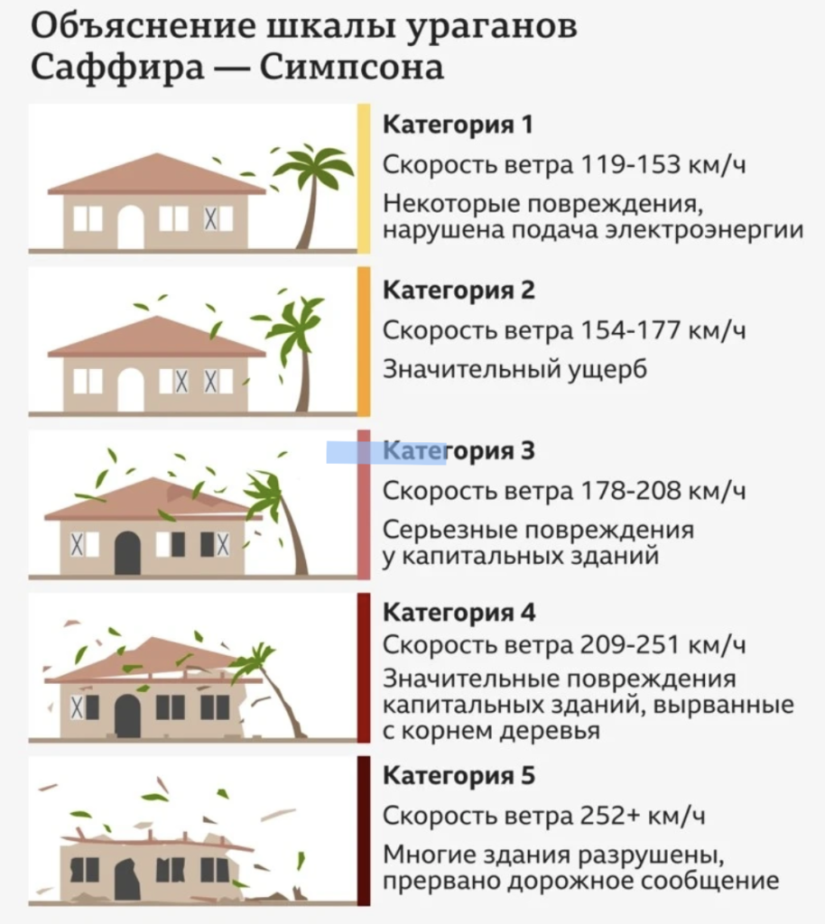 «Милтон» начинался как ураган пятой категории, однако к моменту выхода на сушу метеорологи понизили его до третьей, а сейчас он считается ураганом первой категории, хотя по-прежнему представляет значительную опасность.