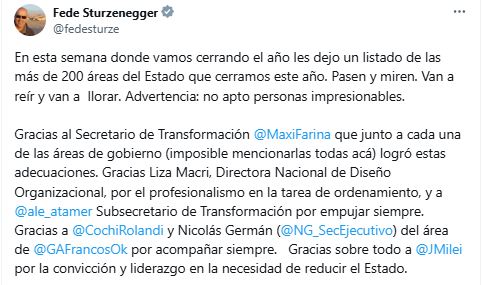 Федерико Штурценеггер, министр дерегулирования и преобразований Аргентины, опубликовал в эту субботу обширный список государственных структур, которые правительство Хавьера Милея закрыло в 2024 году.