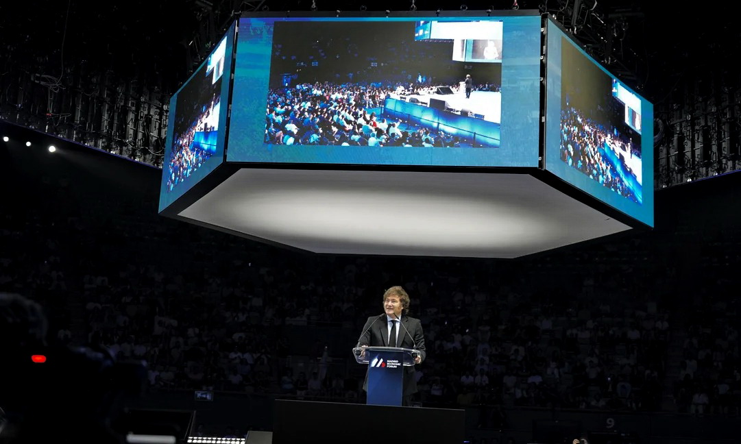 Милей назвал государство «преступной организацией», а налоги — «грабежом». Он обвинил прессу в распространении «грязных новостей» об отмене валютных ограничений: «Мы открыли рынок, и обменный курс близок к нижней границе диапазона. Журналистов не достаточно ненавидят». Президент также отметил успехи в стабилизации валютного рынка в год выборов.