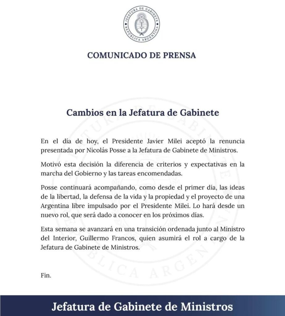 «Сегодня Президент Хавьер Милей представил отставку Николаса Поссе из Кабинета Министров. Это решение было продиктовано разницей в критериях и ожиданиях относительно прогресса правительства и возложенных на него задач. Поссе продолжит поддерживать, как он делал это с самого первого дня, идеи свободы, защиты жизни и собственности и проект свободной Аргентины, продвигаемый Президентом Милей. Он будет делать это в новой роли, о которой будет объявлено в ближайшие дни. Упорядоченный переход произойдет на этой неделе с министром внутренних дел Гилльермо Франкосом, который возьмет на себя роль главы Кабинета министров. Конец».