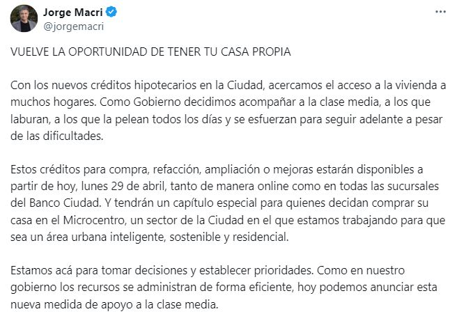 Сегодня утром, через свои социальные сети глава правительства города Буэнос-Айрес Хорхе Макри объявил о возвращении ипотечных кредитов для получения собственного жилья.