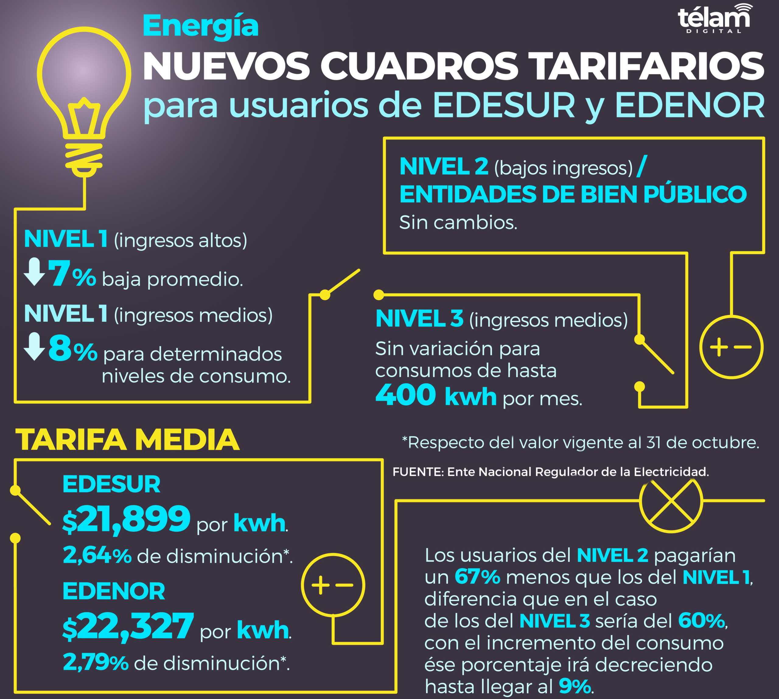 Национальное Управление по Регулированию Электричества (ENRE) утвердило новые тарифы на электроэнергию для пользователей распределительных компаний Edesur и Edenor, со средним снижением на 7% для 1-го уровня доходов и до 8% для некоторых уровней потребления пользователей со средним уровнем доходов